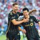 【明報專訊】FC洛杉磯新兵前鋒孫興慜(右)昨在美職於...