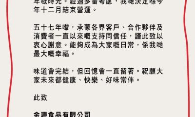 出產本地即食麵「大光麵」的金源食品公布,將於12月結...