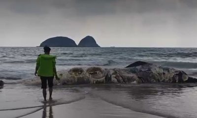 一具鯨魚屍體今早(29日)沖上西貢鹹田灣沙灘,鯨魚1...