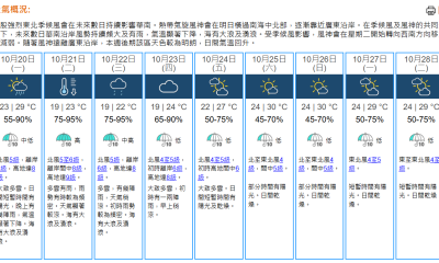 天文台表示,本港周四(9日)大致天晴,局部地區有驟雨...