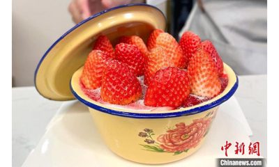搪瓷盆草莓蛋糕最近在內地網絡走紅,草莓蛋糕置在復古感...