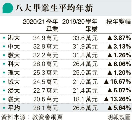 【明報專訊】教資會公布2020/21學年8間資助大學全日制學士學位課程畢業生就業情况,畢業生薪酬繼續上升,平均年薪為28.1萬,較前一學年增長5.64%,其中城大畢業生增幅最多,按年增長約16.7%至最新的24.5萬元(見表)。畢業生失業率及就業不足率亦有改善。