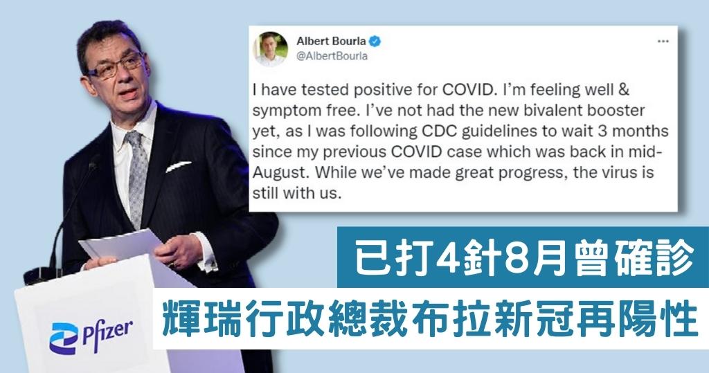 美國輝瑞藥廠(Pfizer)行政總裁布拉(Albert Bourla)上周六(24日)在Twitter表示,繼今年8月確診後,其新型冠狀病毒檢測再度呈陽性,目前感覺良好,沒有病徵。他說自己尚未接種最新的二價新冠疫苗加強劑,因根據美國疾控中心(CDC)指引,確診後隔3個月才能接種。(9月2日相關報道:FDA准BNT莫德納推針對BA.4/5疫苗)