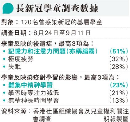 教育 社協訪120曾染疫兒童 23%稱難集中精神學習 發佈於 3 年 前 2022 年 10 月 10 日 By 明報 【明報專訊】根據政府的2019冠狀病毒病第五波數據,截至前日(8日),19歲以下的累計呈報個案數目達21.8萬人,佔該年齡組別總人口約兩成。香港社區組織協會和兒童權利關注會8至9月,向其會員做網上調查,了解「長新冠」對120名曾染疫基層學童的學習帶來的影響,最多人(23%)自稱難集中精神學習。當中林同學稱康復後的記憶力變差,舉例以往用大約一至兩小時溫習的內容,現在或要多花一至兩小時。 相關文章:基層兒童新冠疫情長新冠 Up Next 青年成就×奧雅納 STEM活動教中學生砌橋 盼為工程界播種 不要錯過 中大下學期國安課教案例 校方稱本學期2400人報讀「認識中國」 繼續閱讀 贊助商 猜你喜歡 武漢「封城」市長周先旺遭「雙開」 (16:41) 22名基層兒童到律政司官邸作客 林定國鼓勵「未來的路有很多可能」 (16:21) 百分百擔保貸逾三成違約企業清盤 按證公司:截至上月底累計壞帳率18.5% 免針紙案 蔡淑梅夫否認圖轉移資產 稱妻「奉公守法」 酒吧黑幫謀殺案開審 一被告稱僅掟樽無殺人 內地便利入境旅遊 冀追回疫情失地