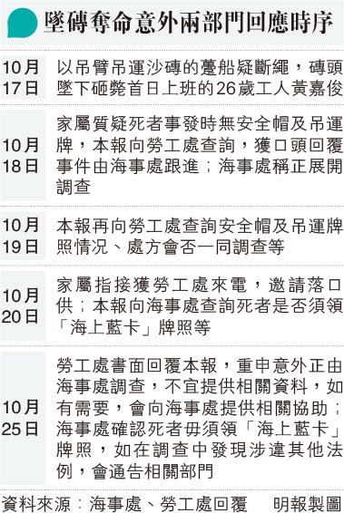 要聞 稱墜磚奪命海處查 勞處第四日約家屬落口供 工權會:調查或有漏洞 盼兩部門勿卸責 發佈於 3 年 前 2022 年 10 月 29 日 By 明報 【明報專訊】大角嘴新油麻地公眾貨物裝卸區上周一(17日)躉船吊運磚頭時墜下砸斃工人,家屬事後質疑公司安排無領相關牌照的死者協助吊運。有別於一般工業意外,勞工處事發當日未有發新聞稿,只口頭向記者表示事件交海事處跟進。事件雖涉躉船,惟死者事發時身處岸上。本報事發第三日(19日)追問死者吊運牌照情况、勞工處會否跟進等,處方翌日始聯絡家屬相約錄口供。工業傷亡權益會總幹事蕭倩文認為事件反映調查或有漏洞,希望勞工處及海事處不要推卸責任。 相關文章:勞工處工業意外職安健法例 Up Next 工業意外罰則 海較陸輕大截 海事最高罰5萬囚1年 擬修陸上例可罰千萬囚兩年 不要錯過 郭卓堅再覆核「賦權廢免針紙」 促法庭頒令法例無效 繼續閱讀 贊助商 猜你喜歡 【Emily】勞處放無人機捉地盤職安違規 孫玉菡未回應政府高層人員變動 稱《強制舉報虐待兒童條例》實施後電話舉報增加 (16:49) 六旬男工昨於西貢一船廠失足跌落6米深處 昏迷留院 (20:27) 工人東涌地盤被鋼筋插傷臀部 (16:59) Y.PARK工傷 環署令承辦商3日交報告 強制舉報虐兒周二生效 社署增近百緊急幼兒宿位
