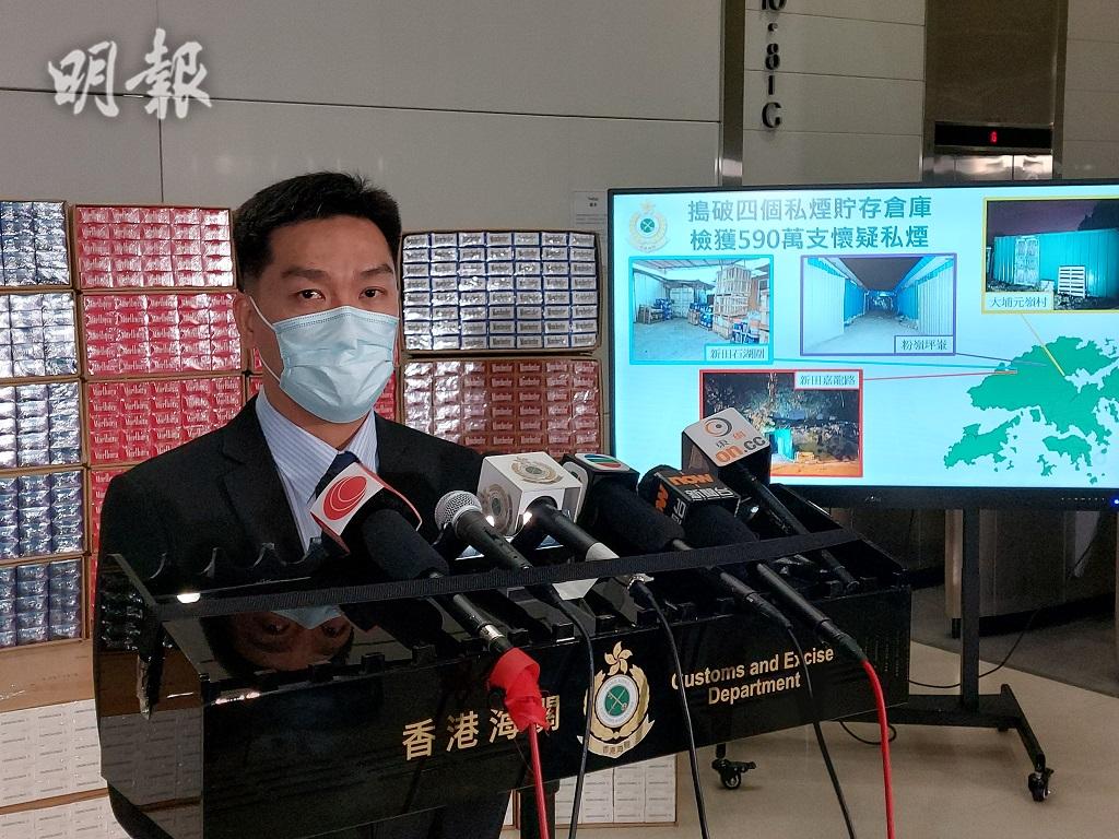 香港海關稅收罪案調查科高級督察梁啓聰稱,海關人員持續兩至三星期全天候監視行動後,鎖定一個活躍新界北區的私煙集團,於昨天晚上及今晨凌晨時份,分別搜查大埔元嶺村、粉嶺坪輋及新田石湖圍4間鐵皮屋及貨櫃場,共搜獲590萬支未完稅香煙,市值1600萬元,行動中拘捕兩名30及58歲男子,兩人報稱司機及退休人士,海關相信其中一人為私煙集團主腦。