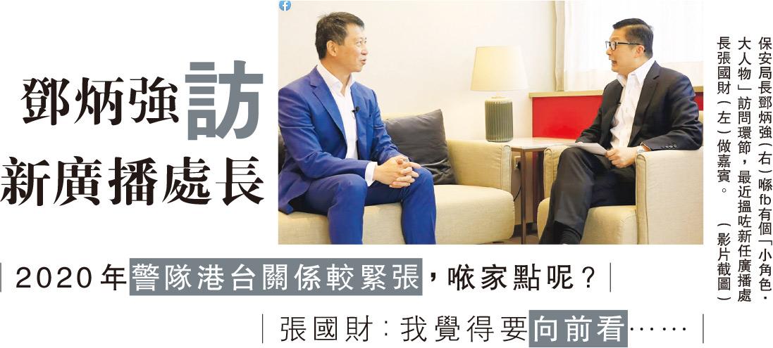港聞 【Emily】鄧炳強訪新廣播處長 發佈於 3 年 前 2022 年 11 月 9 日 By 明報 【明報專訊】新任廣播處長張國財(Eddie)上個月初履新,近排佢接受保安局長鄧炳強訪問,先嚟「快問快答」熱身,問到2019年被派駐比利時擔任香港駐歐洲聯盟特派代表嘅Eddie,喺歐洲最掛住香港啲乜嘢,Eddie快快口話最掛住「男人……」,片段停一停兼加咗啲烏鴉圖案特效,原來Eddie最掛住嘅係「男人的浪漫」,即係豆腐火腩飯呀!至於最鍾意邊個港台節目主持人,Eddie身為廣播處長就話會得罪好多人,所以唔答喇。 相關文章:張國財港台鄧炳強 Up Next 捱報章批評7書 圖書館4日全下架 皆刊於國安法前 康文署:不時檢視書籍違法否 不要錯過 【Emily】港鐵11‧20長者日 嘟卡免費搭車 繼續閱讀 贊助商 猜你喜歡 保安局誓師大會動員撐選舉 電話卡實名制兩年半 同期電騙案飈 保安局:過往兩年惡劣天氣期間累計出動逾1300人拯救攀山或遇溺者 (13:25) 保安局:近期涉學生電騙案多屬假冒外賣平台 (18:08) 樺加沙|鄧炳強:如明知危險仍帶小童觀浪或涉疏忽照顧 盼市民提高安全意識 (11:11) 內地商戶兜售偽造香港證件 鄧炳強指高度關注 已通報內地公安要求移除相關帖文 (17:22)