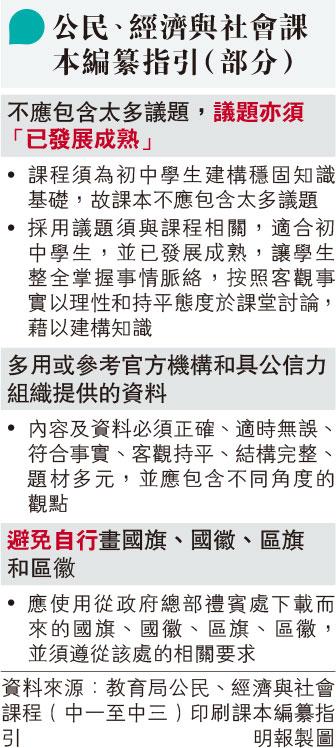 教育 公經社課本限採「已成熟」議題 指引要求多用官方資料 教師憂課堂難有趣 發佈於 3 年 前 2022 年 11 月 22 日 By 明報 【明報專訊】取代初中生活與社會科的公民、經濟與社會科(公經社科)下年9月試行,2024年9月全港中學全面推行,中一課本亦於屆時出爐。教育局近日公布新科的課本編纂指引,要求出版社採用「已發展成熟」的議題,並多採用或參考官方機構等資料。有中學教師稱,採用「已發展成熟」的議題或令課堂失去趣味,但新聞熱話不斷更新,學生或難捉摸事件發展。 相關文章:教育局文憑試生活與社會科 Up Next 平機會:八成中學無時間教性 教師乏培訓 學生問「曾否有性關係」感尷尬 不要錯過 指校方接管屬會難問責 如「中學模式」管大學生 繼續閱讀 贊助商 猜你喜歡 長洲官立中學只辦1班中一 瀕臨「殺校」邊緣 (21:16) 風後狼藉 長洲小學教職員合力清理 樺加沙|教育局宣布所有學校明日及後日停課 政府正評估是否在風後啟動「全政府動員」機制 (14:02) 傑出少年曾患抑鬱 重返校園冀成精神科醫生 「因自己淋過雨,想替別人撐傘」 (11:21) 教師續執業證 海外多定進修時數 議員關注修例必要否 特首:會諮詢聽意見 米娜|幼稚園上午班及全日班明續停課 (16:30)