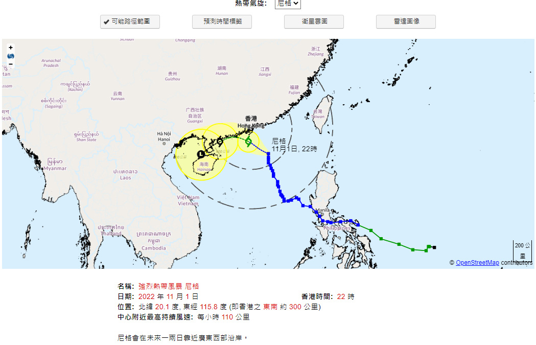 【22:00】三號強風信號現正生效。預料本港平均風速每小時41至62公里。晚上10時,尼格集結在香港之東南約300公里,即在北緯20.1度,東經115.8度附近,預料向西北或西北偏北移動,時速約10公里,靠近廣東西部沿岸。三號強風信號會在明日(11月2日)早上6時前維持。天文台會考慮在明日日間發出八號烈風或暴風信號,但實際時間需視乎本地風力變化。市民應保持警覺,明日早上出門前留意最新天氣消息。