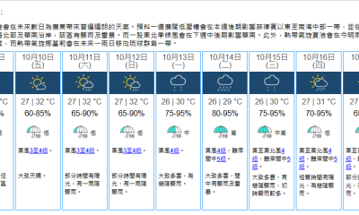 即時熱點 天氣|天文台:多雲有驟雨 下周初至中期漸轉天晴 (08:37) 發佈於 3 年 前 2022 年 11 月 4 日 By 明報 上午8時30分,天文台錄得22.6度,相對濕度88%。 一股清勁至強風程度的東北季候風正影響華南沿岸。同時,驟雨正影響該區。 本港地區今日(4日)大致多雲,有幾陣驟雨。最高氣溫約24度。吹和緩至清勁東至東北風,離岸間中吹強風。展望未來兩三日有一兩陣驟雨,短暫時間有陽光。下周初至中期漸轉天晴。 相關文章:天文台天氣天氣速遞編輯推介 Up Next 新冠疫苗接種|已接種第三針人口達81.5% (20:23) 不要錯過 尼格|天文台改發三號強風信號 (05:23) 繼續閱讀 贊助商 猜你喜歡 天氣|酷熱警告生效 天文台:周末有一兩陣驟雨 (08:22) 天氣|天文台:周四天晴局部地區有驟雨 最高32°C (20:56) 今年10月已有4日達33℃以上 破1884年以來紀錄 (17:45) 天氣|天文台:天晴酷熱最高33°C 局部地區有驟雨 (08:14) 天氣|天文台:周三天晴酷熱 最高33°C (21:00) 水利部和中國氣象局發布山洪預警 (22:56)
