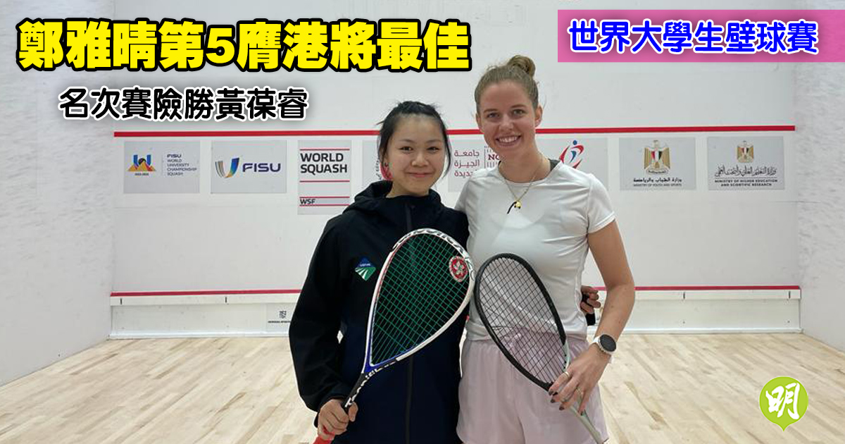 世界大學生壁球錦標賽今日(9日)假埃及舉行,港將鄭雅晴在女單的「內訌戰」跟隊友黃葆睿打足5局,最終在決勝局以11:4勝出,獲得第5名。