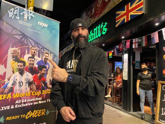 在灣仔駱克道,不少酒吧掛起世界盃參賽國的國旗及宣傳海報。來自約旦、從事時裝行業的Mike,來港7天旅遊及處理公務,今晚獨自到灣仔一酒吧飲酒消遣,他形容現場熱鬧,未來數天都會來觀賞直播,「非常喜歡香港的氣氛(vibes),冀在港結識新朋友」。他表示,在「0+3」安排下,來港首3天只能在酒店買外賣,「只食麥當勞或KFC」,認為港府應豁免已接種新冠疫苗者的入境檢疫要求。他表示,日前完成3天檢疫終可外出,到餐廳品嘗了日本料理及中菜,非常享受。
