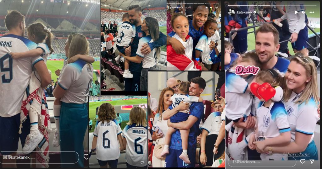 卡塔爾世界盃開鑼,英格蘭首場賽事即以6:2大勝伊朗隊,球迷固然開心,不過最興奮莫過於到場支持的家人。多名球員包括隊長哈利卡尼(Harry Kane)的妻子、前鋒史達寧(Raheem Sterling)和後衛哈利馬古尼(Harry Maguire)等的家人,都親身赴卡塔爾支持,更紛紛上載他們觀賽或完賽後與球員相擁的照片。哈利馬古尼也在Instagram限時動態發布一對女兒穿上其6號球衣的相片,形容她們是「My biggest fans」(我最大的支持者)。(每日郵報)