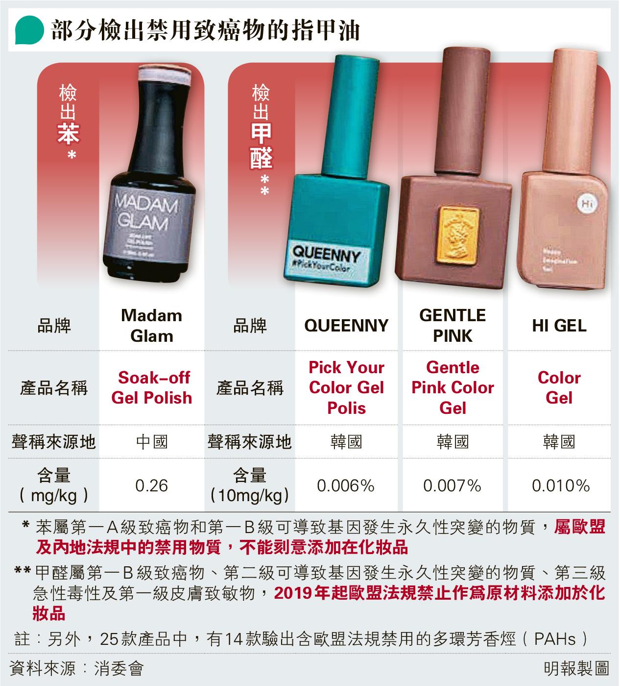港聞 25款Gel甲油 17含歐盟禁用致癌物 發佈於 3 年 前 2022 年 12 月 16 日 By 明報 【明報專訊】臨近節日,不少女士都會裝扮,「Gel甲」是其中一環。消委會測試25款水溶性樹脂指甲油產品(俗稱Gel甲油),發現17款樣本驗出最少一種歐盟禁用的致癌物,當中包括苯、甲醛及多環芳香烴。消委會稱對結果感意外,建議消費者避免使用含禁用致癌物的產品,已將相關樣本的測試結果轉交海關跟進。海關回覆,收到消委會報告後已立即跟進,試購懷疑不安全的產品做安全測試,仍在進行。 相關文章:指甲油消委會 Up Next 警首揭本地註冊公司經遊戲程式運作線上賭場 拘22人涉逾7700萬賭款 (18:06) 不要錯過 【Emily】建造商會推ESG App 工友飲水儲分換獎品 繼續閱讀 贊助商 猜你喜歡 消委接8宗星薈投訴涉61萬 事主追討摸門釘 新任總幹事沈朝暉:研引入AI改革消委會投訴系統 將開源節流及重整資源 (15:11) 消委會︳今年首8個月接548宗涉藥房投訴 有商戶混淆「両變錢」計價單位推銷藥材 (11:14) 消委會︳九成半私營兒童疫苗計劃需全數預繳 徵詢醫生意見部分機構須額外收費 (11:08) 消委會︳九成泥狀清潔面膜檢出至少1種重金屬 兩款含量超內地及美國標準 (10:26) 消委會.男裝內衣|7款總評達4.5星或以上【附名單】 (13:25)