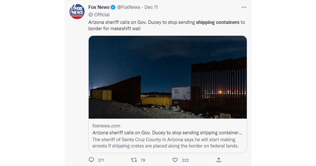 下月即將卸任的美國亞利桑那州共和黨籍州長杜西(Doug Ducey),近日持續安排在接壤墨西哥邊境以多個貨櫃列陣,阻止非法入境者進入。當地一名警長批評此舉是「非法傾倒」,將拘捕任何企圖在其縣內放置這些貨櫃的人。