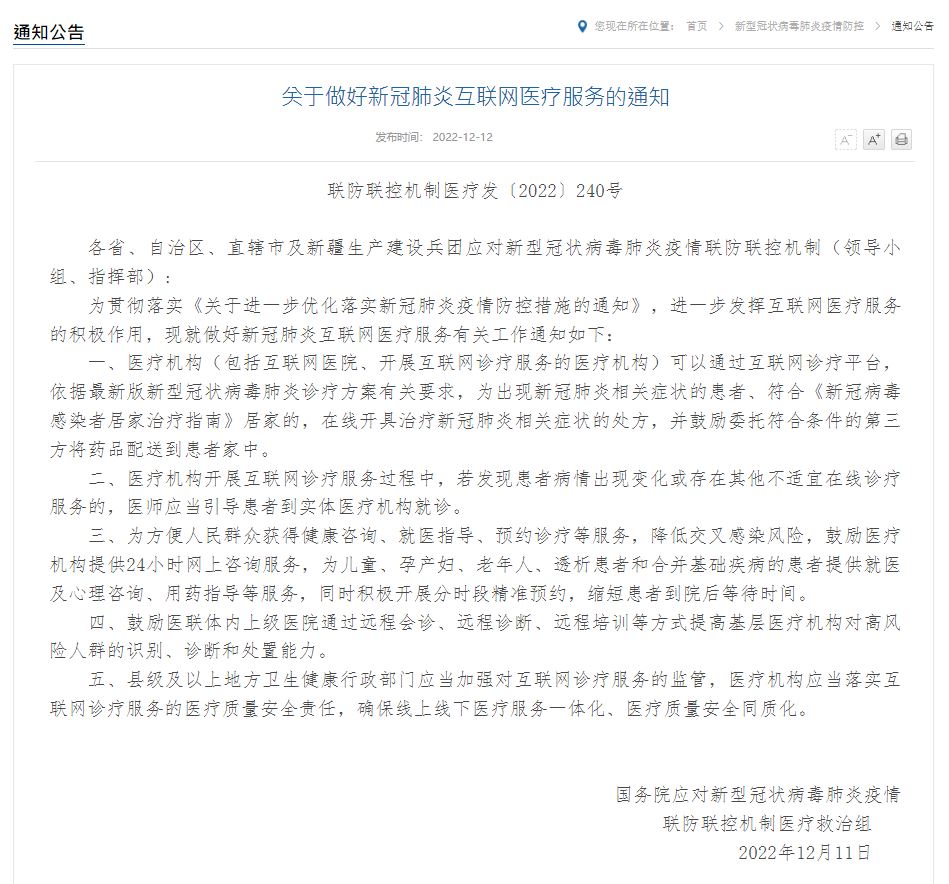 通知還表示,鼓勵醫院通過遠程會診、遠程診斷、遠程培訓等方式,提高基層醫療機構對高風險人群的識別、診斷和處置能力。縣級及以上地方衛生健康行政部門應當加強對互聯網診療服務監管。