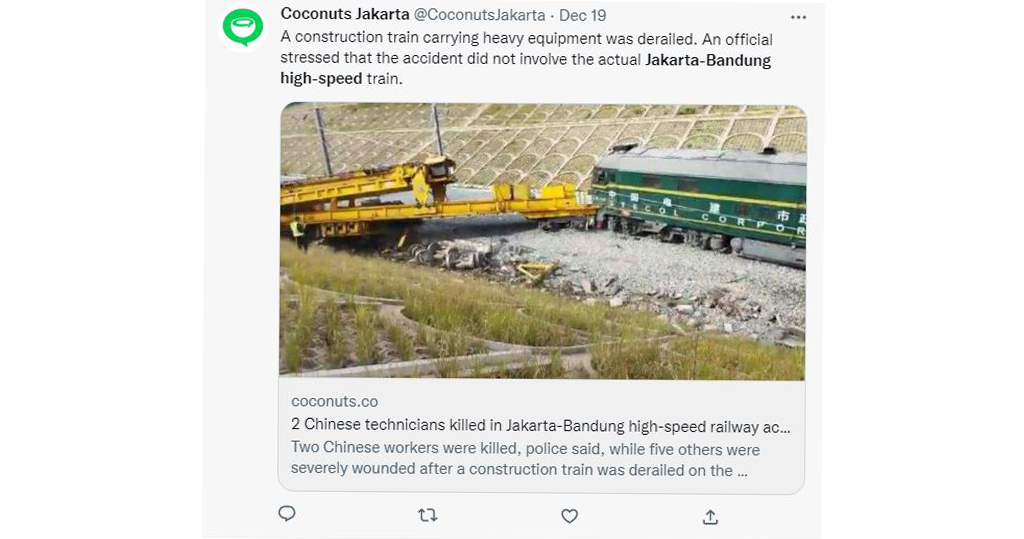 《雅加達郵報》周二(20日)報道,建造商印尼中國高鐵公司(KCIC)提供的聲明確認,事發於周日(18日)下午5時左右,西萬隆縣百打拉冷鄉(Padalarang)一條鄉村的施工現場有工作列車翻側,導致兩名外國技術工人死亡和4人受傷。東南亞新聞網站Coconuts引述印尼警方消息,指出兩名死者都是中國公民,分別是40歲的Chang Shin Shang和36歲Chang Shin Yung。