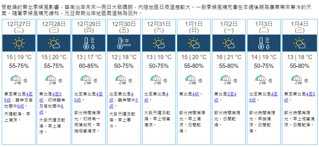 【21:45】本港地區今晚(26日)及明日(27日)天氣預測:天晴乾燥,明早天氣清涼,市區最低氣溫約15℃,新界再低幾度。日間最高氣溫約19℃。吹和緩至清勁東至東北風,明日離岸及高地間中吹強風。展望周三大致天晴,早上仍然清涼,新界日夜溫差較大。隨後一兩日天氣轉冷。九天天氣預報顯示,12月29日周四市區氣溫將跌至13℃。