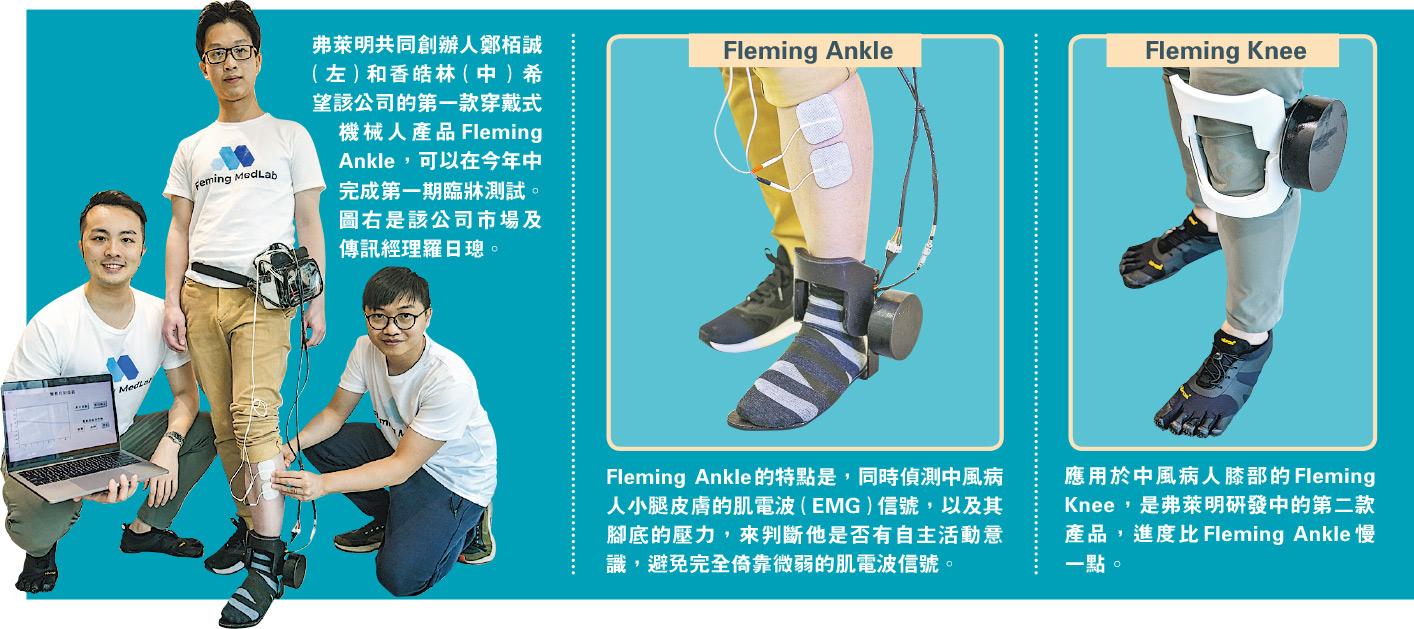 弗萊明成立的目的,就是為了研發一種更適合協助中風倖存者恢復活動能力的醫療級穿戴式機械人。該公司的穿戴式機械人,除了感應中風病人皮膚的肌電波信號,還同時透過多個壓力傳感器,來偵測中風病人的自主活動意識。之後再根據神經科學原理,給予中風病人適當的電刺激,令他們嘗試做出想做的動作。例如,該公司的第一款產品「Fleming腳托」(Fleming Ankle),乃應用於中風病人的腳踭(腳踝)步態訓練,會同時偵測病人小腿皮膚的肌電波信號,以及其腳底的壓力。