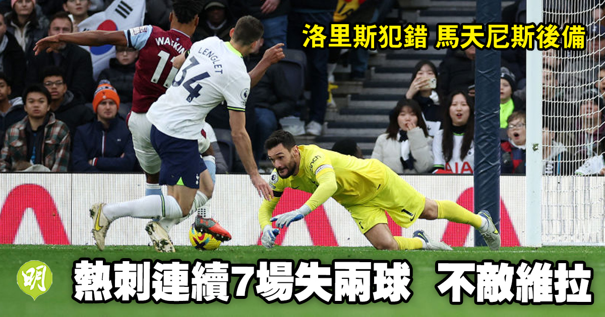 世界盃冠亞軍門將未能在元旦日英超再交手。剛歸隊的達米安馬天尼斯今晚(1日)先列後備,見證阿士東維拉主場2:0淨勝有洛里斯下半場犯錯失球的熱刺。後者連續7場失最少失兩球,復賽後兩場不勝排第5,並較大部分前列競爭對手都多踢一場。