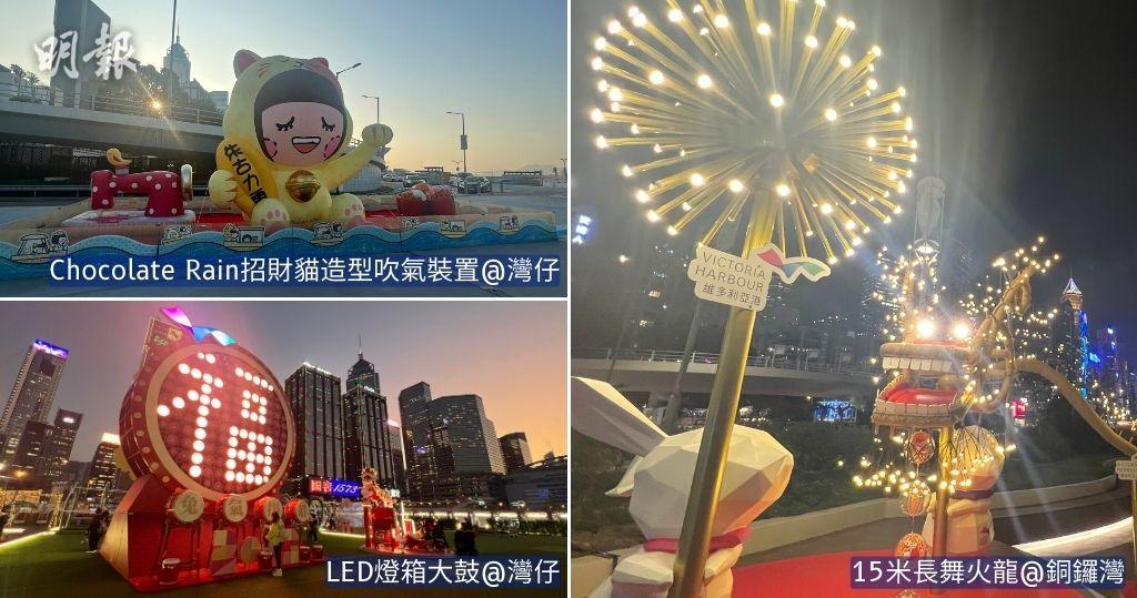 農曆新年將至,港島海濱灣仔至銅鑼灣段設置了新春賀年佈置,明報電子平台組記者以短片帶大家觀賞3大特色裝置:銅鑼灣「活力避風塘主題區」15米長舞火龍、灣仔「水上運動及康樂主題區」3米高Chocolate Rain招財貓造型吹氣裝置及十二生肖造型,以及灣仔「HarbourChill海濱休閒站」9米高雙面「LED燈箱大鼓」立體裝置,大鼓旁更有巨型心心走廊及心心相印心跳感應器。新春年初一至年初三期間,更有舞獅道具,讓市民打卡,歡度佳節。(拍攝及剪接:林梓晴 統籌:何芍盈)