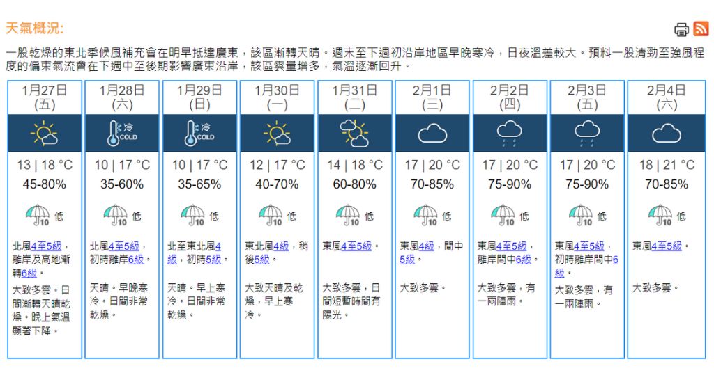 【19:00】天文台預測,本港地區今晚(26日)及明日(27日)大致多雲。明早清涼,氣溫約15度。日間漸轉天晴乾燥,最高氣溫約18°C。明晚市區氣溫顯著下降至最低約13°C,新界再低兩三度。吹和緩偏東風,明日轉吹北風,風勢逐漸增強。展望隨後兩三日天晴乾燥,天氣寒冷。周末期間市區最低氣溫約10°C,新界再低幾度。