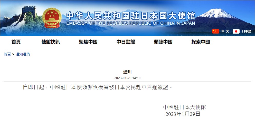 即時兩岸 中國駐日使館:恢復審發日本公民赴華普通簽證 (16:00) 發佈於 3 年 前 2023 年 1 月 29 日 By 明報 中國駐日本大使館今日(29日)宣布,即日起,中國駐日本使領館恢復審發日本公民赴華普通簽證。 中國駐日本大使館1月10日曾宣布暫停審發日本公民赴華普通簽證。國家移民管理局次日表示,針對近期少數國家對中國公民實施歧視性入境限制措施,國家移民管理機構對韓國、日本公民暫停簽發口岸簽證,暫停韓國、日本公民來華實行72/144小時過境免簽政策。 (中國駐日本大使館微信公號) 相關報道: 華停韓日公民過境免簽 (2023年1月12日) 相關文章:中國日本簽證華停韓日公民過境免簽 Up Next 金門縣長廈門晤宋濤 金酒解禁可輸陸 (14:02) 不要錯過 網紅拍片烹食瀕危大白鯊 罰12.5萬人民幣 (15:35) 繼續閱讀 贊助商 猜你喜歡 Trip.com年度報告:港人平均外遊飛3次 日上月內地旅客增3% 近4年最低 按月大跌21% 同期港訪日旅客量跌逾8% 護主逃生災後解僱 外傭獲延長簽證 沖繩北大東島設雷達部隊 監視華艦軍機太平洋動向 日本旅遊局:首11月赴日遊客人數超去年 惟11月中國客增幅放緩 (16:31) 足球|三浦知良落實擔任今屆《紅白》評審 (17:10)