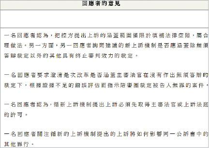 港聞 律政司修例意見摘要 以「一名回應者」稱呼團體 發佈於 3 年 前 2023 年 2 月 22 日 By 明報 【明報專訊】政府建議修訂《刑事訴訟程序條例》中控方針對原訟庭「毋須答辯」上訴程序,並諮詢持分者意見,本報發現,律政司諮詢法律界及部分政府部門後整理諮詢意見,提交立法會文件的意見摘要中,以「一名回應者」(a respondent)來指稱提供意見者,亦無提及回應者諮詢者名單。有議員認為,政府可交代回應者身分,讓各方更理解意見。 相關文章:刑事訴訟程序條例律政司 Up Next 剝牙中昏迷 中年漢命危 不要錯過 【Emily】市建推院舍先導 科技藝術照顧長者身心 繼續閱讀 贊助商 猜你喜歡 法庭裁公廁「男女分隔」規例違憲 律政司不服上訴 (17:17) 任建峰遭「釘牌」惹質疑 律政司斥任曾呼籲外國制裁港官 有違律師專業 (21:41) 曾指非禮案主控嚎哭不專業 區院發文件澄清身分 區院法官批「主控官」嚎哭 更正指律政司代表非當日主控官 (17:36) 【Emily】副刑檢專員放長假做實習大狀 「師父」係陳馮富珍子 聽聞無意離開律政司 鐵騎士避人失控亡 攔車休班關員不被檢控 警:報告交死因庭 死者女友:期望不高,仍感憤怒