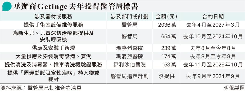 【明報專訊】聯合醫院手術燈塌下傷人事故,揭發公立醫院共有23支手術燈有潛在風險,承辦商均為Getinge。醫管局連日來指非常不滿承辦商的維修保養表現。紀錄顯示,Getinge本地供應商過去一年投得醫管局6份標書,至少涉款3256萬元,包括為醫管局手術室設備提供維修服務至2027年、為新生兒及兒童深切治療部安裝呼吸機等。有立法會議員及病人組織認為,墜燈事故反映相關承辦商保養水平似乎不理想,建議醫管局檢查涉事承辦商所有醫療儀器。醫管局昨回覆查詢時稱,將派員突擊巡查涉事承辦商工作及檢視其維修保養的其他醫療儀器。