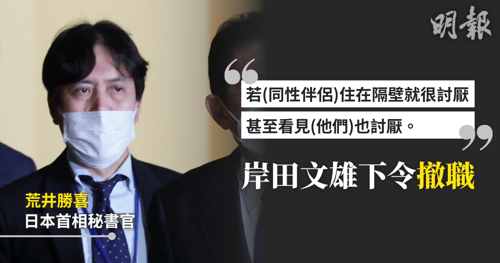 日本首相秘書官荒井勝喜周五(3日)發表涉及歧視性小眾(LGBT)言論,稱討厭這些人住在隔壁,引起爭議。日前才稱同性婚姻可能影響社會家庭結構的首相岸田文雄,今日(4日)斥荒井的言論「荒謬」,宣布將他撤職。