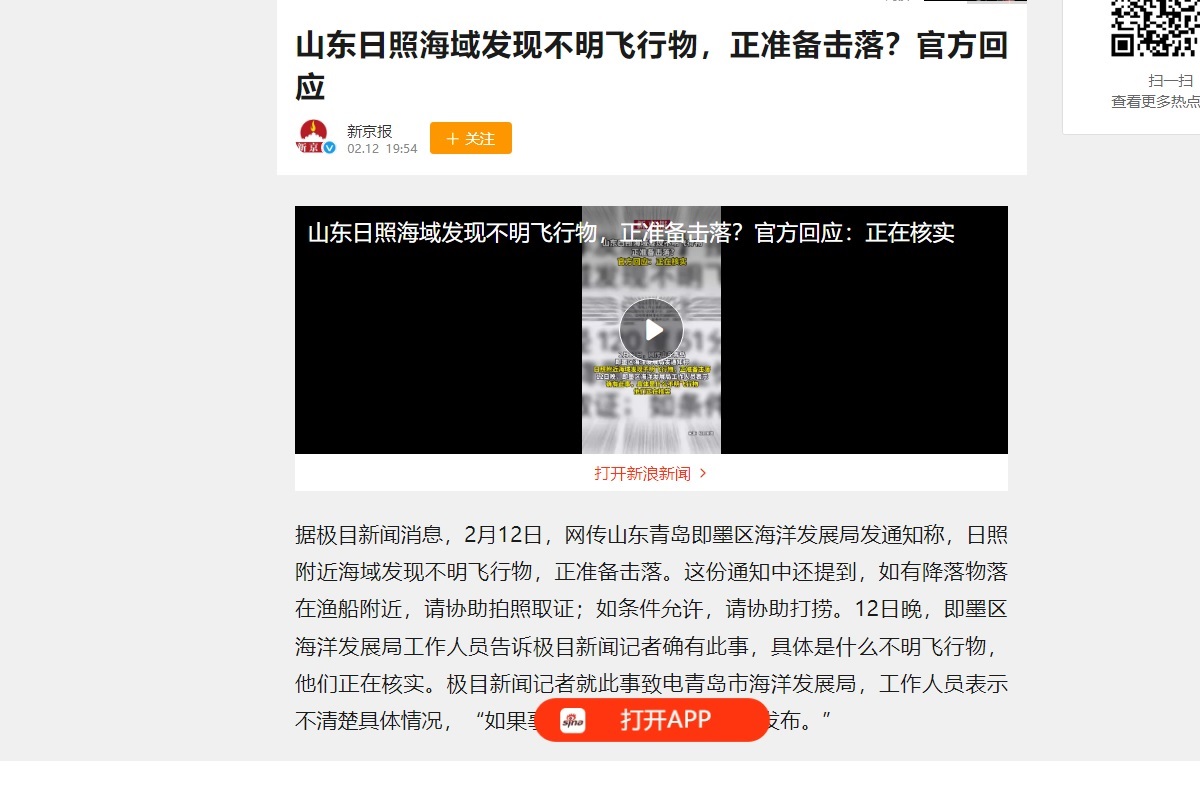 即時兩岸 內媒﹕山東對出發現不明飛行物 準備擊落 (23:02) 發佈於 3 年 前 2023 年 2 月 12 日 By 明報 中美因「氣球事件」關係緊張之際,中國湖北日報傳媒集團旗下「極目新聞」周日(12日)晚上報道,指「中國青島即墨區海洋發展局發通知稱山東省日照附近發現不明飛行物,具體位置於東經120度51分,北緯35度37分,正準備擊落,呼籲附近海上作業漁船注意避險,並在發現附近海面有降落物後,協助拍照取證」。極目新聞其後向青島市海洋發展局查詢,對方則表示不清楚具體情况,稱「如果事情屬實,後面可能會有發布」。 截至本文晚上10時半截稿時,內地官方未有進一步公布。 (新浪網) 相關文章:不明飛行物中國氣球中美角力 Up Next 2022年全國查辦掃黃打非案1.3萬宗 處罰逾4000人 (17:37) 不要錯過 氣球風波|美列6中國實體入黑名單 疑涉氣球計劃 (13:19) 繼續閱讀 贊助商 猜你喜歡 中方籲世貿成員共同維護多邊貿易體制 (10:31) 美貿易代表:盼中美「非敏感」領域增貿易 特朗普揚言對進口家具加徵「高額關稅」 點名中國 (01:14) 美國農業部貿易事務次長訪台 (20:46) 美「複製者」計劃滯後 軍方接手加快採購備戰 波音對華大單談判 美使:處最後階段