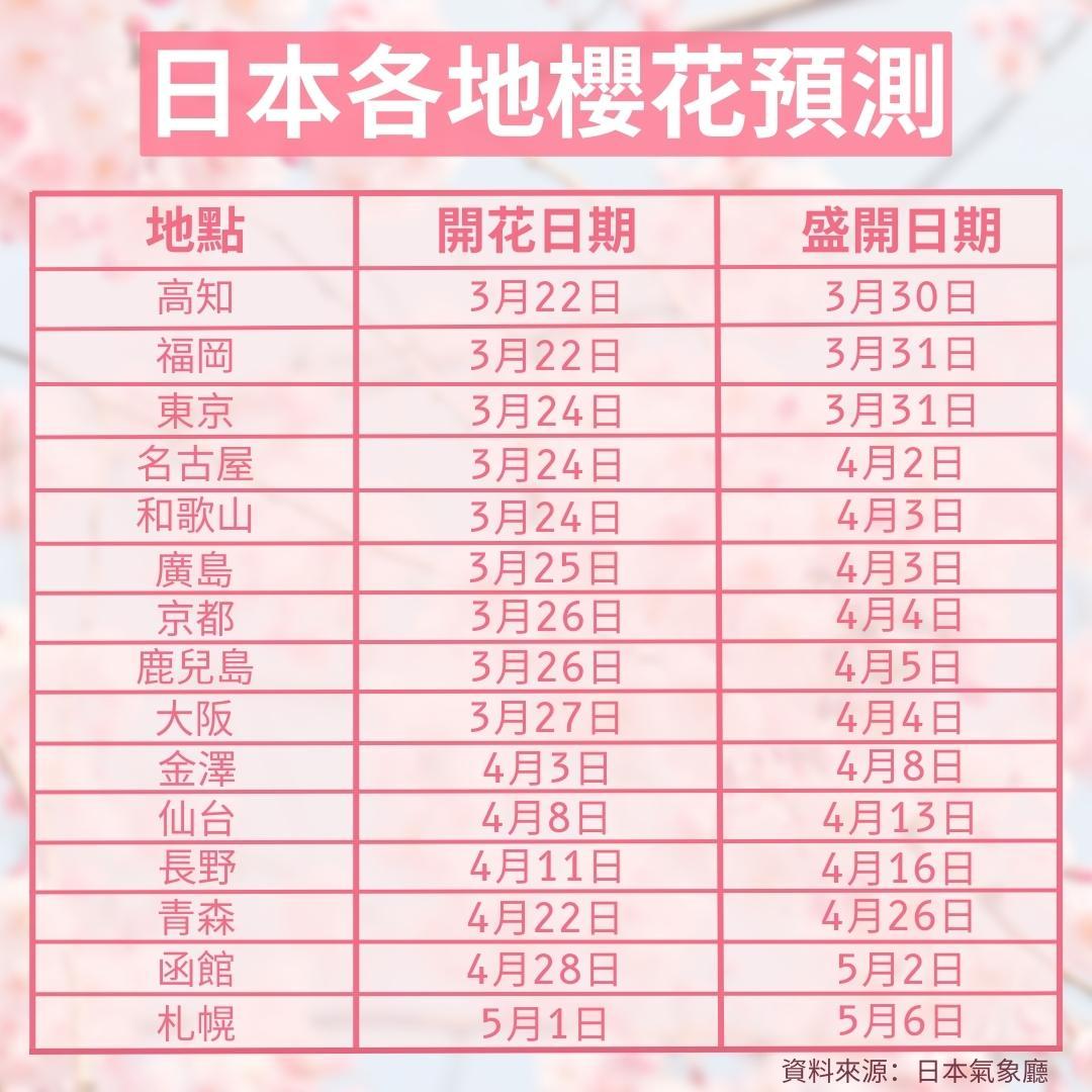資料來源:日本氣象廳(開花預測、盛開預測)