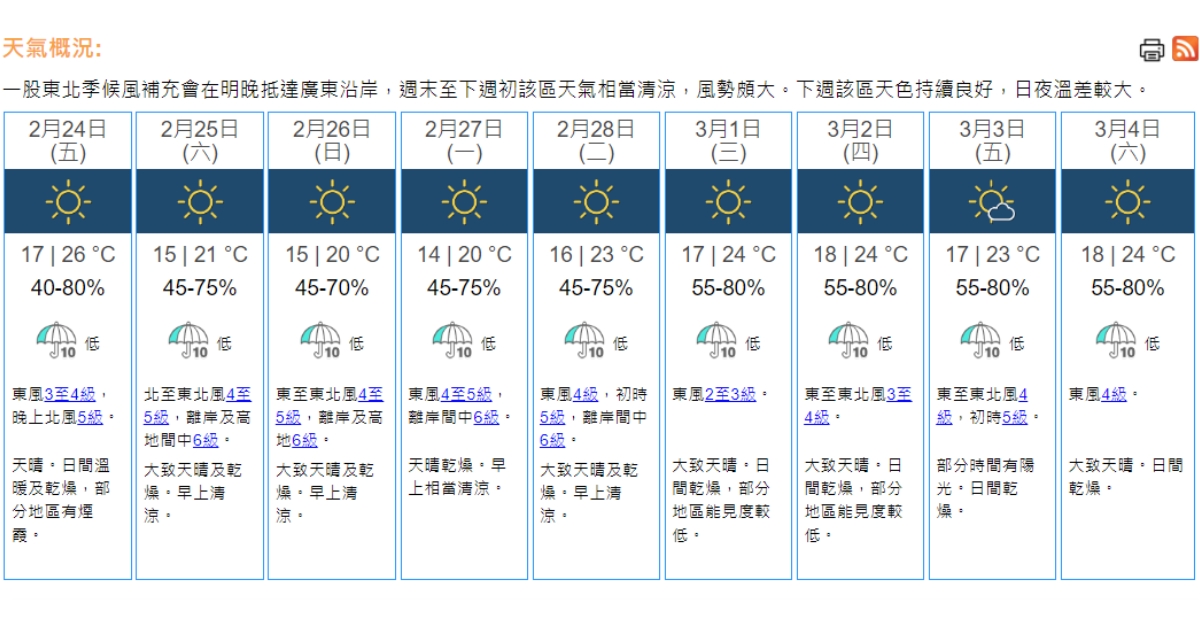 【20:00】天文台預測本港地區今晚(23日)及明日(24日)天晴。明日市區最低氣溫約17℃,新界再低兩三度,日間相當溫暖及乾燥,部分地區有煙霞,最高氣溫約26℃。吹輕微至和緩偏東風,明晚北風增強。展望周末至下周初大致天晴及乾燥,風勢頗大,早上相當清涼。