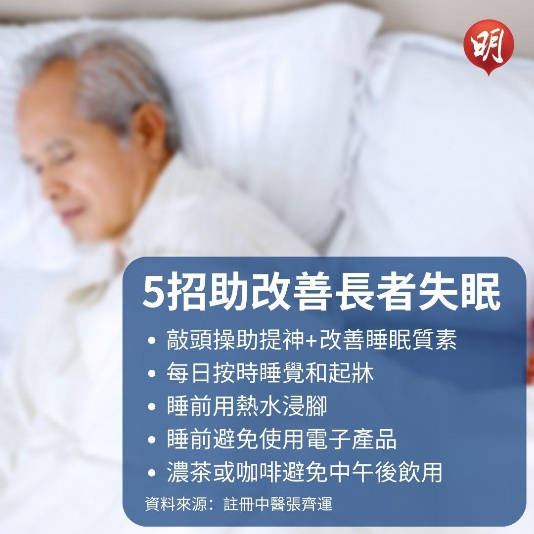 長者失眠問題普遍,難以入睡、容易醒、甚至徹夜難眠,影響身心健康。註冊中醫張齊運接受明報電子平台組訪問表示,一般人每日需要睡7小時,年紀、生活習慣、作息等都可能會影響睡眠,他教5招幫助改善長者失眠問題。