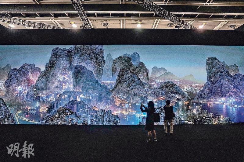 【明報專訊】甫踏入Art Central 2023的展場,是一片伸手不見五指的黑暗,唯一的光源來自右面那幅長達18米的巨型LED屏幕——水墨畫狀的山壑底部,夾着河流一樣的城市夜景,時不時迸裂出顆顆煙花。這是內地藝術家楊泳梁的視頻裝置,從鳥瞰視角捕捉大灣區的《極夜花火》,亦是「該作品有史以來規模最大的展示」。還未正式進場,已被龐巨的視覺經驗洗刷感官。彷彿預告:藝博會作為疫後復常的首輪國際活動,各方各面無可擺脫一種奇觀性質。