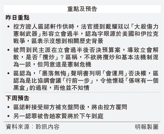 區之前曾提及,初選參加者各區會議上有協議,但戴耀廷表示他們毋須簽署文件。鄒家成的代表大律師陳世傑昨日提及,鄒是否藉「墨落無悔」展示抗爭決心,重申戴的說法?區同意,但分別在於戴沒公開交代。辯方指出,鄒在會議對戴稱,議員就預算案「一係投票,一係唔投」;區不同意,稱鄒當時是問戴「點解係用『積極』,而唔係用『會』(用否決權)」。