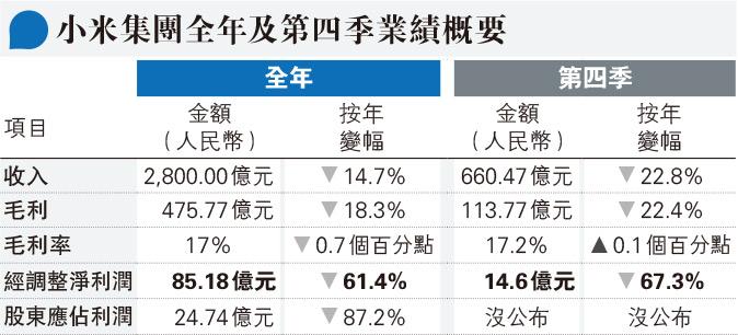 全年計,小米經調整淨利潤85.18億元,跌61.4%;全年收入跌14.7%至2800億元,當中智能手機收入1672億元,跌19.9%,因智能手機出貨量跌20.9%,至約1.5億部,但在全球54個國家和地區智能手機出貨量排名第三,且每部智能手機平均售價1111元人民幣,創歷史新高,抵消出貨量減少的部分影響。