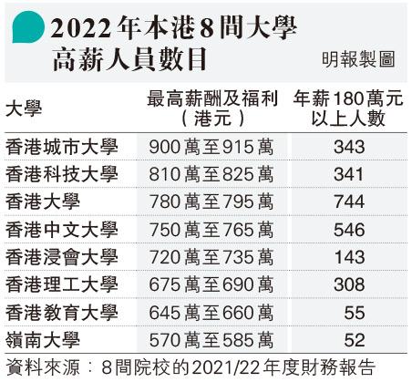 遠慮之外,還有近憂。在一窩蜂跑世界排名、跑關鍵表現指標(KPI)、「搶人才」的風氣驅動下,本地各大學高層行政管理人員正在擴張。假如以180萬元以上年薪為參考,在2021/22年度,八大院校就一共有2532名高薪人員。這群既高且貴的行政人員,跟各院校按年獲教資會整體經常撥款的變化、大學整體世界排名表現的關係,仍待驗證明白。
