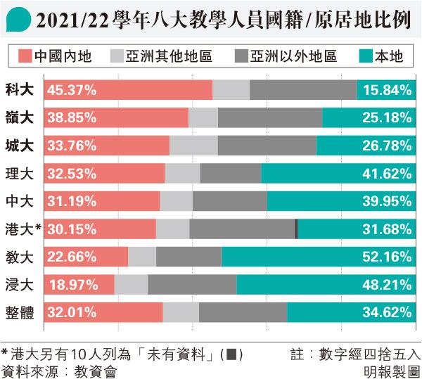 【明報專訊】本報早前報道,8間資助大學的「本地」教員在過去4個學年持續減少,「中國內地」背景教員則明顯增加。教資會回覆本報查詢的數據顯示,在2021/22學年(上學年),科大、嶺大及城大的內地教員多於本地教員,其中科大逾45%教員是內地背景,比例為八大中最多。科大表示,招聘時按申請人的學歷、學術成就等因素甄選。嶺大副校長莫家豪認為,內地學者涉獵的研究與教學領域較本地和外國學者更多元,對大學而言相當吸引。