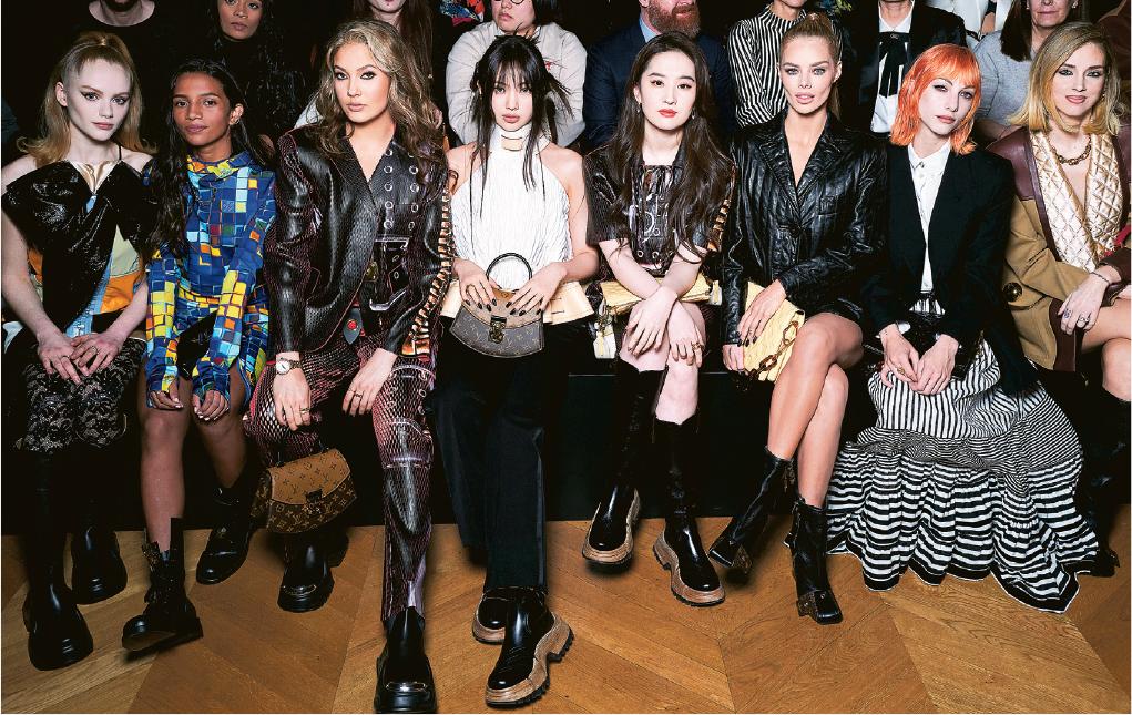 另一邊箱,Saint Laurent來季以tailleur-jupe(女士剪裁套裙)及肩線剪裁利落的powersuit反映當下女性強悍一面。台下嘉賓及品牌大使BLACKPINK的Rosé則展現不同風姿,品牌為來賓發布的相片,效果不是匆匆拍下的snapshot,而是充滿聖羅蘭式時尚冷酷的黑白照,效果有型得令人窒息。2023秋冬季的Gucci,是Alessandro Michele離任而Sabato De Sarno還未上任的一個系列,在欠缺創意總監領導下,與之前Alessandro Michele具隱喻和奇幻創意的設計比較,顯得有點乏善足陳,幸好有A$AP Rocky、Dakota Johnson和韓國女團NewJeans的Hanni等撐場,各人本身個性迥異,穿品牌不同風格的衣飾,顯得比來季系列更有睇頭。Loewe的多名品牌代言人也出席來季的時裝騷,韓國女團NMIXX的機場造型,似足大學生grad trip旅行在機場的留影,天真爛漫得與Loewe有點格格不入,幸好有湯唯「補飛」,穿上來季主打的一條「模糊」印花長裙,手持全新Paseo手袋,完美演繹品牌時尚又藝文的獨特風範。●