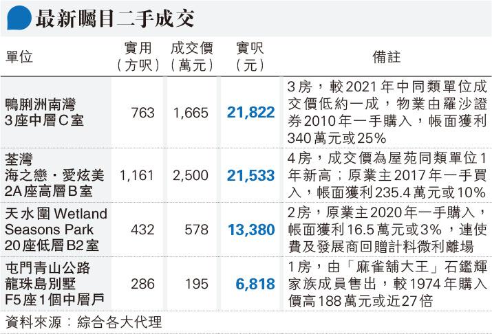 市場續有基金或名人沽貨,羅沙證券或相關人士近日以1665萬元售出鴨脷洲南灣3座中層C室,實用面積763方呎,3房1套間隔,實呎21,822元,較2021年中一個同座同面積低數層C單位成交價1850萬元低約一成。羅沙證券等2010年約1325萬元一手購入,帳面獲利340萬元或25%。
