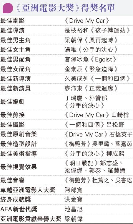 娛樂 《亞洲電影大獎》得獎名單 發佈於 3 年 前 2023 年 3 月 13 日 By 明報 【明報專訊】(請看附圖) 相關文章: Up Next So Ching開騷 阿Mo鼓勵「一定得」 Winka:COLLAR演唱會見 不要錯過 自封「百變Sing君」 Jer樂做隊友心靈治療師 繼續閱讀 贊助商 猜你喜歡