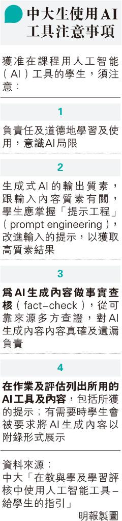 教育 中大生准用AI否 教師決定 課程列明 發佈於 3 年 前 2023 年 3 月 13 日 By 明報 【明報專訊】人工智能(AI)機械人ChatGPT近日興起,掀學術界關注。中大近日發布「在教與學及學習評核中使用人工智能工具的指引」,分師生版本,學生指引提及,除非獲教師明確允許,一般原則下禁止使用AI工具完成作業、評核和計分項目;同時,根據不同課程的學習成果、設計及評核方式,可採取其合適使用AI的方式,有關細節須在課程大綱、作業列明。如學生不當及未經授權使用AI工具,行為涉違反學術誠信,或被罰開除學籍。 相關文章: Up Next 調查稱76%港人不願生育 倡設產子津貼 不要錯過 機智小孩:洞察人情——李崇 繼續閱讀 贊助商 猜你喜歡