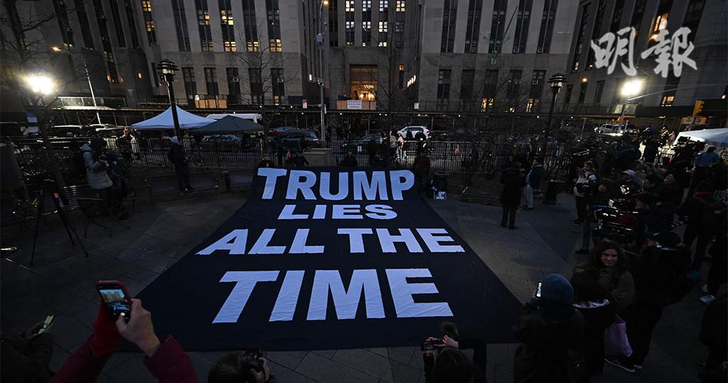 美國前總統特朗普因涉2016年參選總統期間支付「掩口費」掩飾醜聞,紐約曼哈頓大陪審團周四(3月30日)公布起訴他。【相關熱點:一文看解構特朗普「掩口費」案件詳情】紐約曼哈頓刑事法院大樓外,有大批警員、媒體及反對特朗普的民眾聚集,有反特朗普示威者展示「特朗普總是撒謊」(Trump Lies All The Time)的大型橫幅,並舉起「拘捕特朗普」(Arrest Trump)標語。NBC報道,紐約警方再度加強警力,以防特朗普支持者可能發動示威、騷亂。