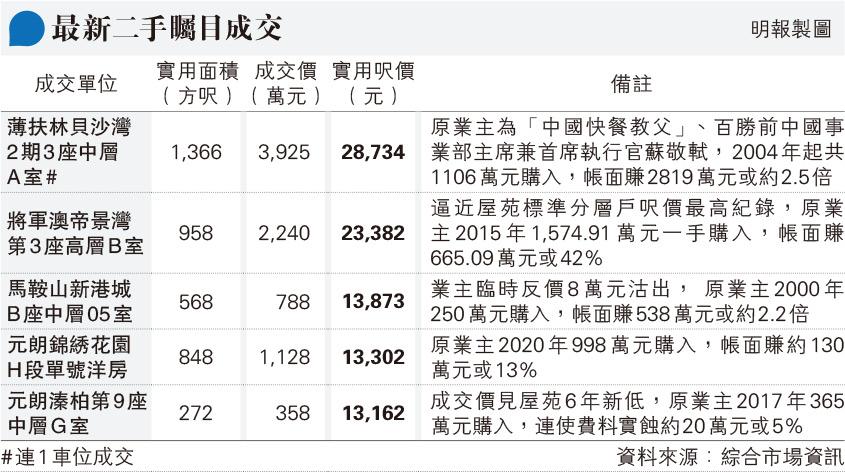 【明報專訊】樓市轉活,近月二手市場亦頻現大額成交,並不時錄得名人買賣物業個案。資料顯示,百勝集團前中國事業部主席兼首席執行官蘇敬軾,本月初以3925萬元連車位售出薄扶林貝沙灣2期3座中層A室,實用1366方呎,3房連套房間隔,實呎28,734元。蘇敬軾2004年1050萬元購入單位,及後再以56萬元購入一個車位,合共作價1106萬元,帳面獲利2819萬元或約2.5倍。
