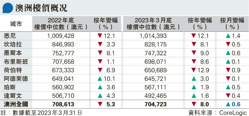 儘管目前仍未可確定澳洲息口何時見頂,利率水平亦已升至2012年以來的高位,當地樓市卻漸現起色。CoreLogic早前發表報告顯示,上月澳洲全國住宅價格按月微升0.6%(見表),為自去年4月以來首次錄得升幅,打破了連續10個月的下跌趨勢,主要基於期內當地4個主要城市悉尼、墨爾本、布里斯班及珀斯的住宅價格均告上升,其中以悉尼樓價升幅最大,按月升1.4%。