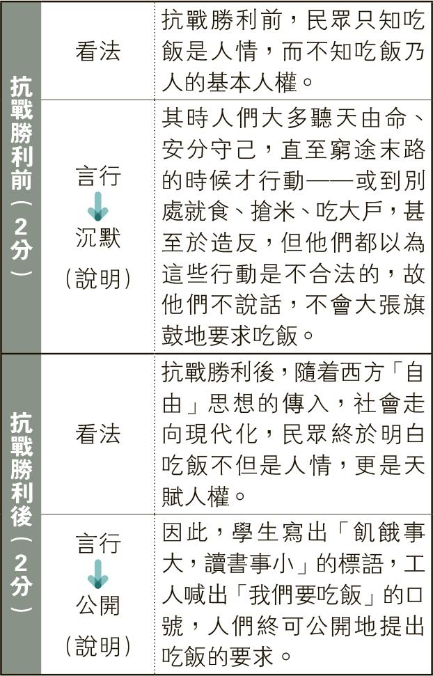 教育 參考答案 發佈於 3 年 前 2023 年 4 月 21 日 By 明報 【明報專訊】1. C 相關文章:推薦 Up Next 校董選出、支持改組 陳德霖任中大校董副主席 不要錯過 遊車河啟發動畫創作 浸大生證AI不能取代 繼續閱讀 贊助商 猜你喜歡 申訴署查房委房協打擊「濫用公屋」程序 一年兩研公屋議題 公署:不時接「沒妥善跟進」投訴 高院國安案脫罪 倡可上訴翻案 修例賦權律政司「案件呈述」 原只能就法律爭議上訴 議員促房協扮演「實驗室」 研方案助夾心階層上車 港燈:停電因誤為「沒紀錄電纜」通電 現場、電路圖皆沒標示 議員批低級錯誤 難禦加租、資助減半 粉嶺幼園停辦 位處私人物業 教聯:20多校面對類近壓力 訪英晤大臣 重申不認BNO 許正宇答英官:用BNO不會批MPF