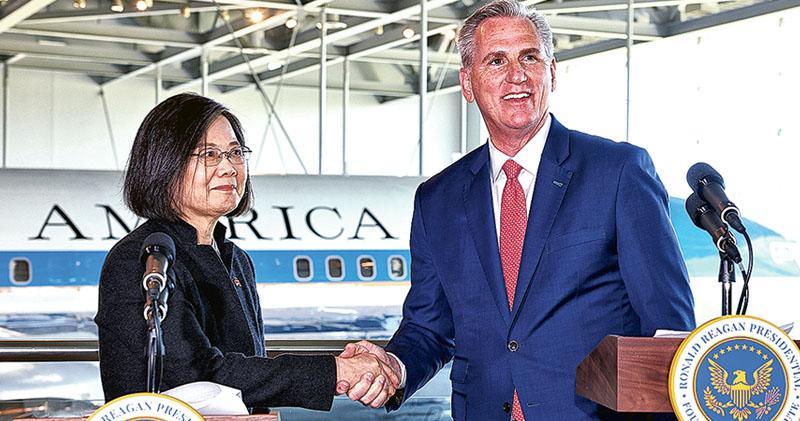 【明報專訊】美國聯邦眾議院議長麥卡錫(Kevin McCarthy)周三率跨黨派議員,在加州洛杉磯近郊的列根總統圖書館與台灣總統蔡英文會面,兩人在會面後發表公開談話。麥卡錫稱,美台之間的紐帶比以往任何時候都要強勁;蔡英文表示,美國國會的支持讓台灣人民感到不孤單。在北京,四大部門抗議,其中外交部強調中方將採取堅決有力措施,捍衛國家主權和領土完整。《華盛頓郵報》分析指,這次會晤標誌着台方8年來努力提升國際形象的高峰。