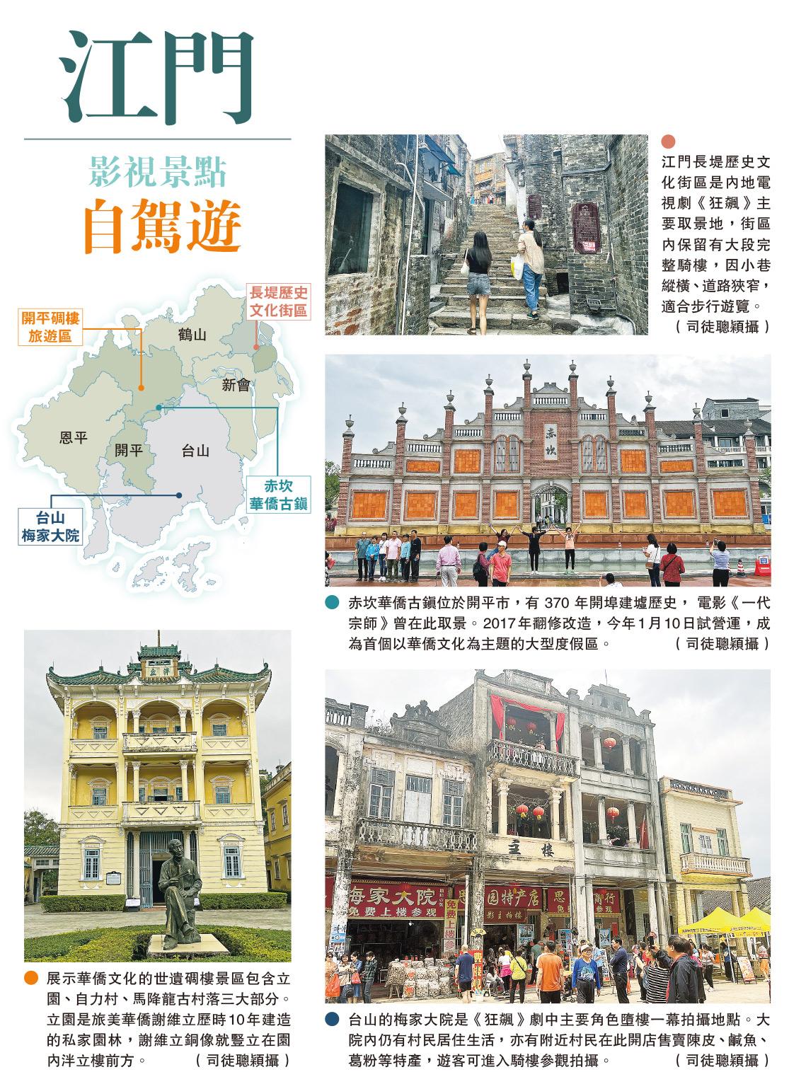 內地電視劇《狂飆》帶起江門旅遊熱潮,充滿嶺南特色的「騎樓」歷史文化街區、中西合璧的台山梅家大院成為遊客打卡點。除了《狂飆》取景地,江門還有著名的開平碉樓群落,以及電影《一代宗師》拍攝地自力村、赤坎古鎮等名勝。日後港車北上落實,江門也是不錯的短途自駕遊之選。