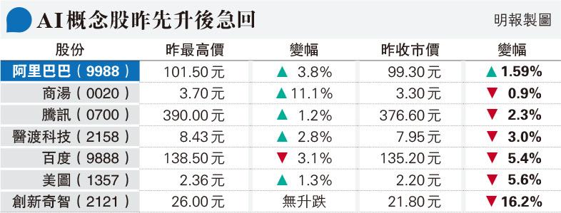 【明報專訊】AI(人工智能)概念股長假前「落鑊」,惟昨日遭網信辦就管理AI生成式服務發意見徵求,潑了「一頭冷水」,商湯(0020)曾帶頭漲逾一成,中午一度轉跌逾6%,聯同跌半成的百度(9988),率領不少二線AI股下跌。恒指亦受拖累,早段大漲逾400點後反覆回軟,全日升不足1%,升幅蒸發大半。